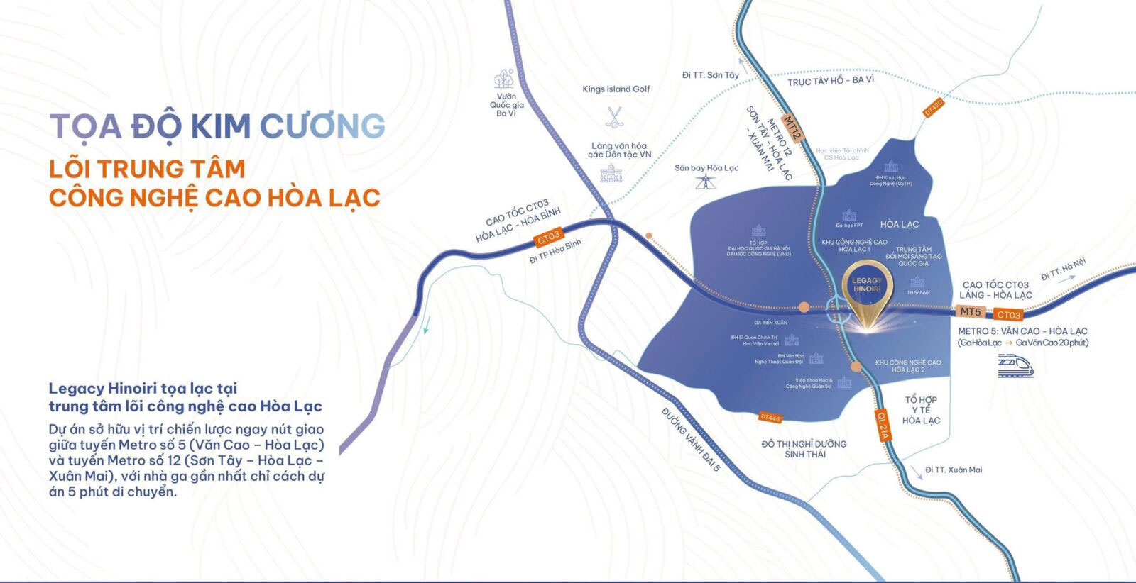 Dự án Legacy Hinoiri sở hữu vị trí “tâm điểm vàng” tại khu vực Tây Hà Nội, tọa lạc ngay trong lõi “Quận công nghệ” – Khu Công nghệ cao Hòa Lạc. Với vị trí chiến lược nằm trên trục đường lớn, dự án mang đến khả năng kết nối hoàn hảo với các cơ quan nhà nước, doanh nghiệp lớn như Trung Tâm Đổi Mới Sáng Tạo Quốc Gia (NIC Hòa Lạc), VNPT IDC, Viettel, Bưu điện Hòa Lạc và Nissan.